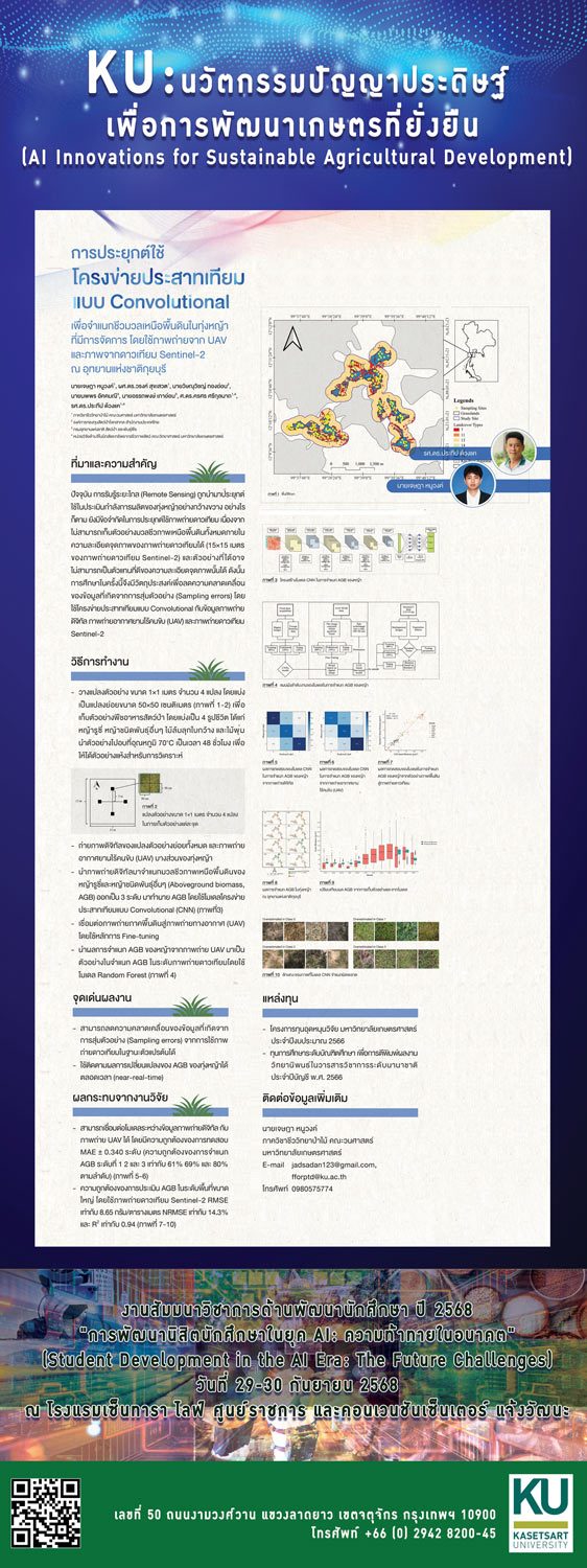 การประยุกต์ใช้โครงข่ายประสาทเทียมแบบ Convolutional เพื่อจำแนกชีวมวลเหนือพื้นดินในทุ่งหญ้าที่มีการจัดการ โดยใช้ภาพถ่ายจาก UAV และภาพจากดาวเทียม Sentinel-2 ณ อุทยานแห่งชาติกุยบุรี |