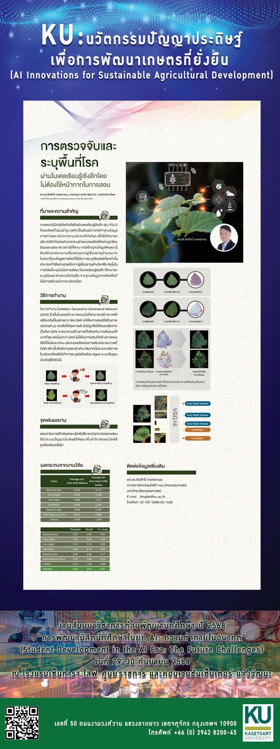 | 3 | การตรวจจับและระบุพื้นที่โรค ผ่านโมเดลเรียนรู้เชิงลึก โดยไม่ต้องใช้หน้ากากในการสอน | รองศาสตราจารย์ ดร.ธีรสิทธิ์ เกษตรเกษม ภาควิชาวิศวกรรมไฟฟ้า คณะวิศวกรรมศาสตร์ |