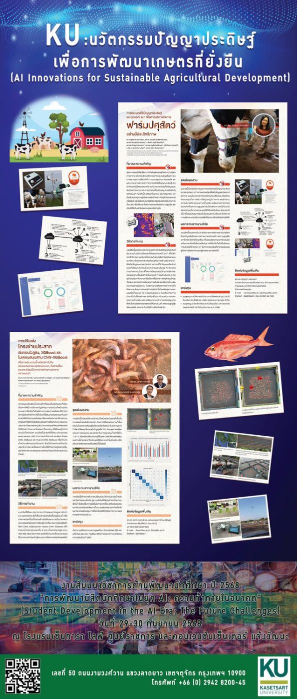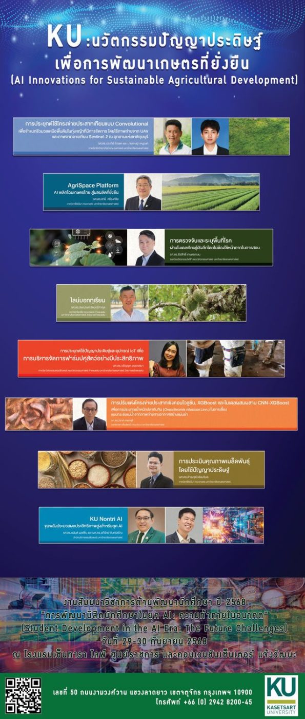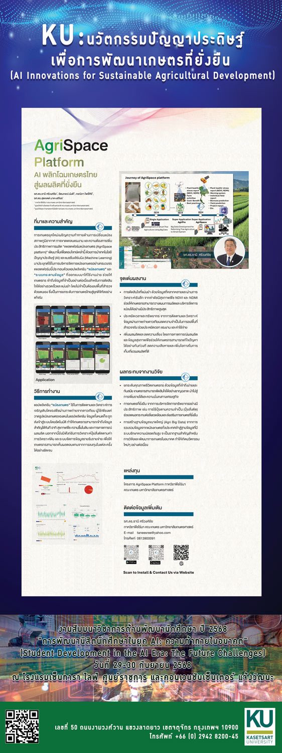 | 2 | AgriSpace Platform : AI พลิกโฉมเกษตรไทย สู่ผลผลิตที่ยั่งยืน | รองศาสตราจารย์ ดร.ธานี ศรีวงศ์ชัย ภาควิชาพืชไร่นา คณะเกษตร |